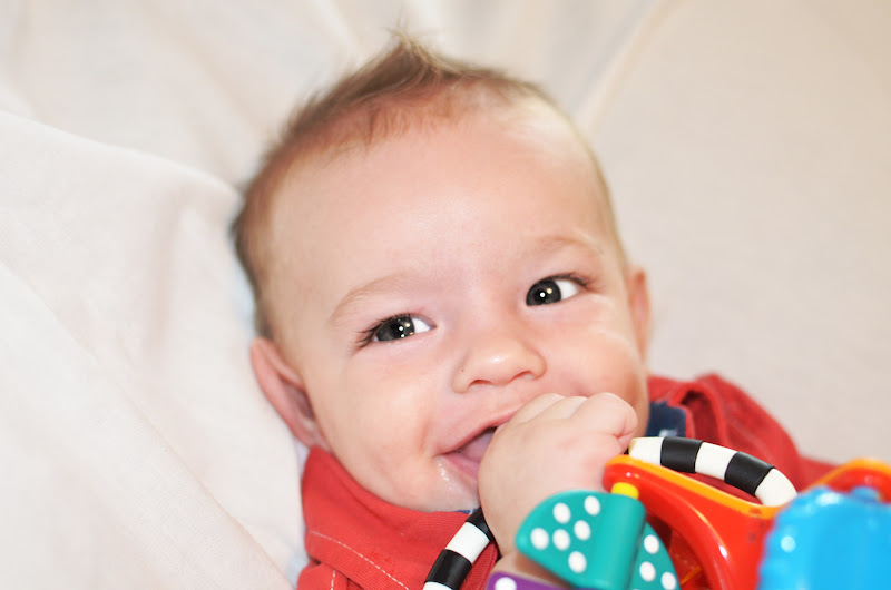 | It's fun to see him notice toys now. Of course they go straight to his mouth... |